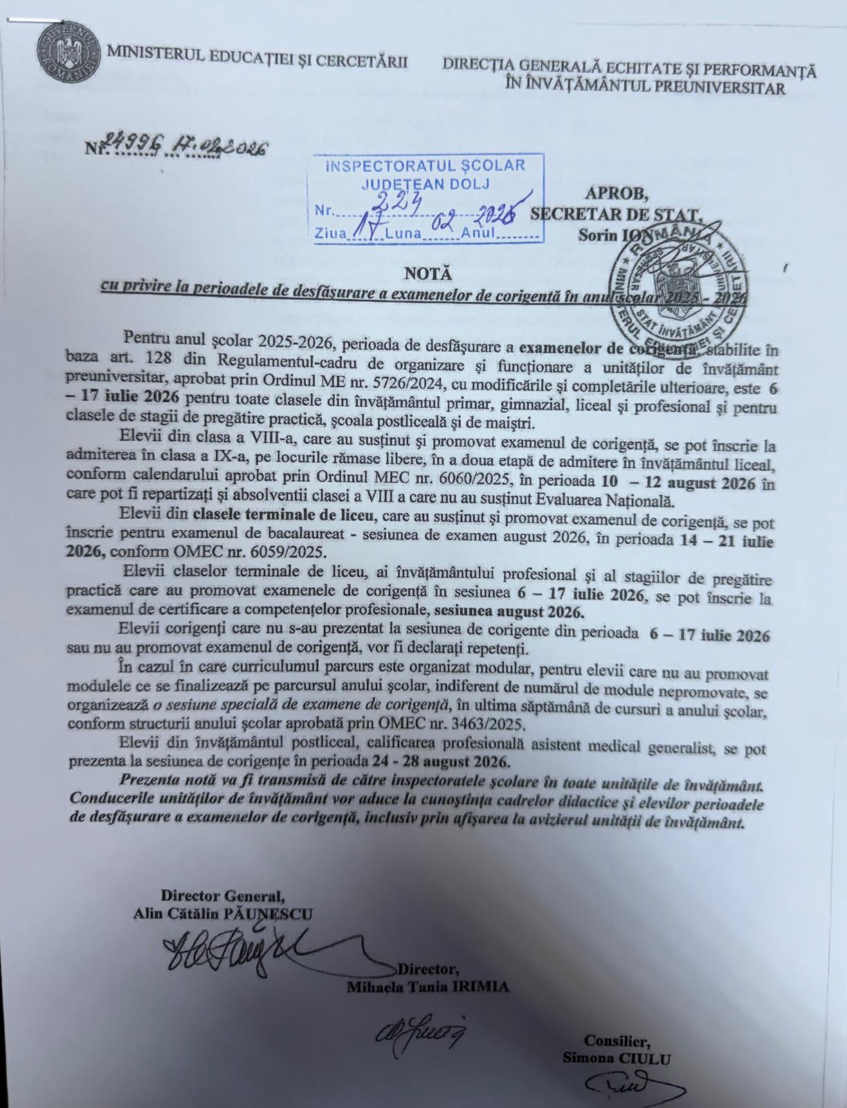 Nota Ministerului Educației și Cercetării privind perioadele de desfășurare a examenelor de corigență în anul școlar 2025–2026